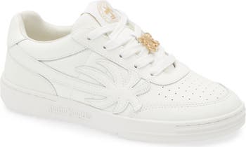 A leafy palm tree appliqué shades the side of a perforated leather sneaker with a university crest on the tongue and logo hardware gleaming on the laces.