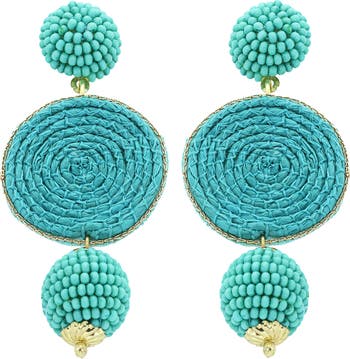 Turquoise-hued beads and woven raffia form these lightweight drop earrings that'll add instant texture to your ensemble.