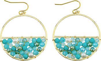 Golden wires wrap around the faceted beads and faux pearls which fill the lower half of these open-circular drop earrings.
