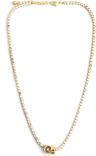 Simple yet striking, this tennis necklace with a bezel-set cubic zirconia with barrel beads and is dipped in a 14k-gold finish.