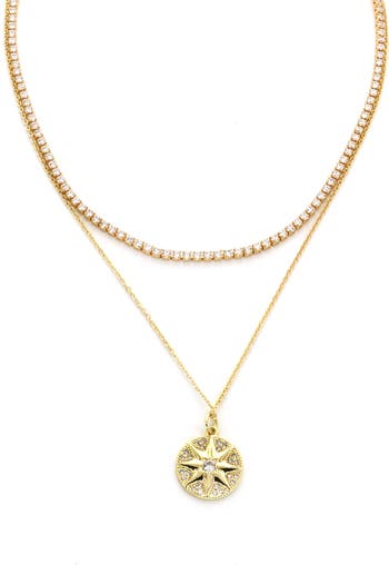 Sparkling cubic zirconia enrich a double-row necklace showcasing a glamorous tennis chain and star medallion pendant.