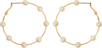 Glass faux pearls trace these slender hoop earrings plated in warm 14-karat gold for elegant shine.
