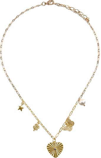 Show off whimsical shine with this mixed-charm necklace including a textured heart, dainty butterfly, lustrous freshwater pearl, sparkly clover and mini star.