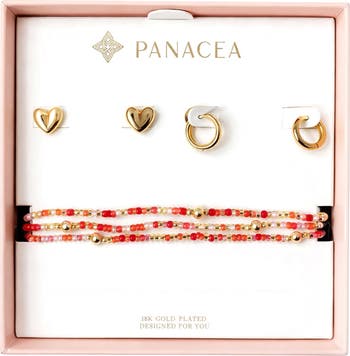 Show off romantic shine with this set of mini heart studs, huggie-hoop earrings and beaded stretch bracelets.