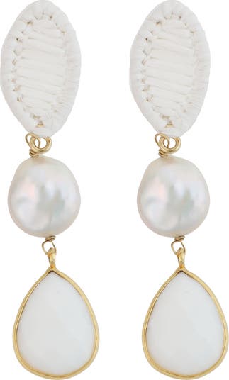 Cultured pearls, raffia and stone inlay define a pair of linear-drop earrings designed to elevate your everyday stack.