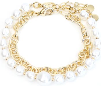 Perfect to stack or show off solo, this gleaming set includes a lustrous faux-pearl bracelet and polished mariner chain plated in warm 14-karat gold.