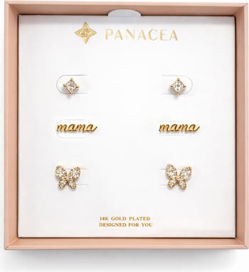 A lovely gift, this dainty earrings set includes square cubic zirconia studs, 'mama' script studs and pavé cubic zirconia butterflies for instant charm.