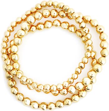 Bring fluid shine to your stack with this set of three beaded stretch bracelets plated in warm 14-karat gold.