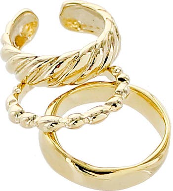 This set of three rings is polished with twisted and etched designs, making them perfect for stacking or sparkling solo.