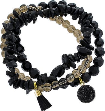 Tassels and charms adorn a suede and stone bracelet set that stretches for the perfect fit.