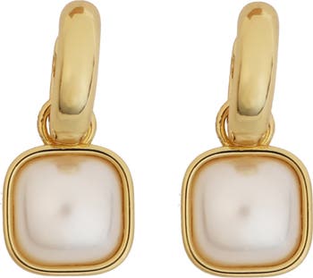 Bring a glow to your lobes with these modern hoop earrings adorned with bezel-set faux pearls styled in a unique square shape.