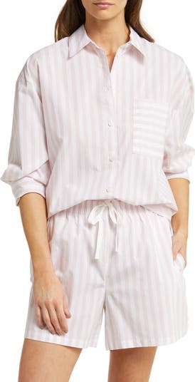 Lightweight cotton lends breezy comfort to these striped pajamas with an oversized button-up top and matching boxer-inspired shorts.