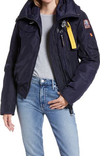 Utilitarian details inspired by parachutist gear add to the take-charge attitude of this water-resistant bomber insulated with cozy down.