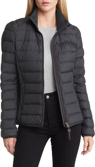 Get endless warmth without bulky weight in a down-filled puffer jacket that features a slim fit and water-repellent exterior.