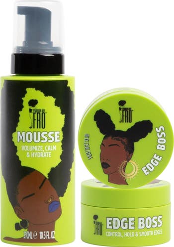 How to use: Section clean, damp hair and apply 2 to 3 pumps of the Mousse to each section. Massage through and style as desired. Apply a small amount of the Edge Boss Gel to wet or dry hair along the hairline. Using slight pressure or a comb, continually smooth down hair on scalp until it is silky straight. Apply more gel as needed.