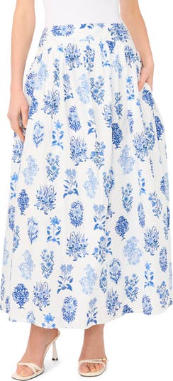 A vintage-inspired floral print boosts the charm of this breathable cotton-blend maxi skirt framed by smocked waist insets and handy side pockets.