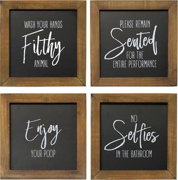 Make family and guests smile while visiting the restroom with this Set of 4 Bathroom Wall Art by Stratton Home Decor. The handcrafted set features four humorous sayings, "Enjoy Your Poop," "Wash Your Hands Filthy Animal," "Please Remain Seated For The Entire Performance," and "No Selfies In The Bathroom." Each printed on a black matte board in a mix of fun font styles and finished in a walnut-stained wood frame. Display them together to create one large square arrangement or hang them separately around the room for a chuckle at every turn.