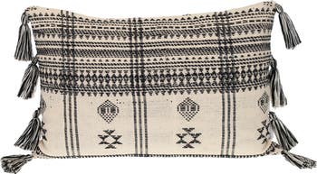 Elevate any couch or bed space with this decorative pillow detailed with geometric embroidery and outlined with flowy tassels.