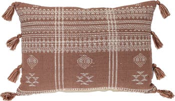 Elevate any couch or bed space with this decorative pillow detailed with geometric embroidery and outlined with flowy tassels.