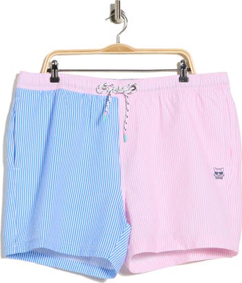 Move from the beach to the boardwalk with ease in these drawstring swim trunks cut from two-tone fabric and outfitted with pockets.