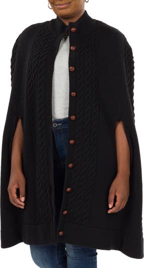 Textural cable stitches and a ribbed mock neck bring cozy style to this sweater-knit cape that's perfect for chilly days.