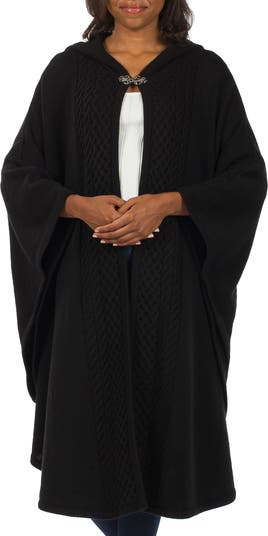 Cable stitches enhance the cozy vibe of this hooded sweater-knit cape framed by an ornate clasp and drapey sleeves.