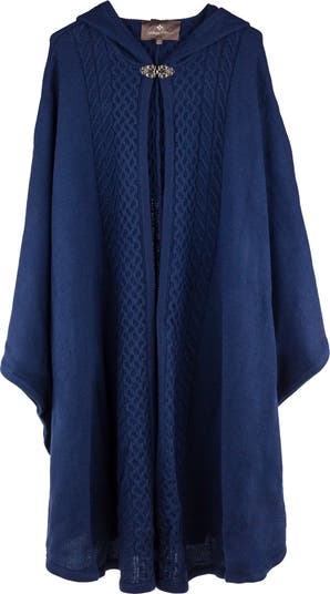 Cable stitches enhance the cozy vibe of this hooded sweater-knit cape framed by an ornate clasp and drapey sleeves.