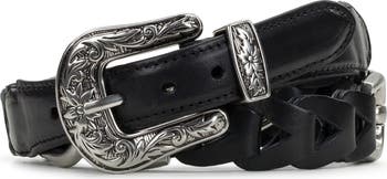 Add a western-inspired touch to your outfit with this leather belt highlighted by a chain-inspired pattern and brushed-nickel hardware.
