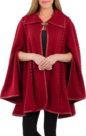 Sleek faux-leather trim and stitches bring vintage-inspired charm to this soft sweater-knit cape framed by an ornate clasp and split sleeves.