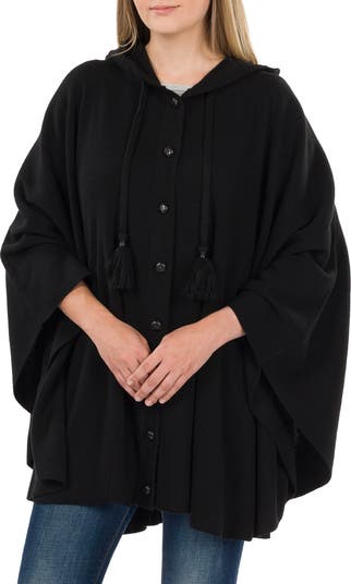The perfect layer for chilly days, this cozy sweater-knit cape is framed by a drawstring hood with tassel ties and an easy front-button closure.