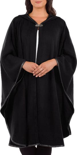 An ornate clasp and faux-leather trim enhance the vintage-inspired charm of this cozy hooded cape textured by elegant cable stitches.