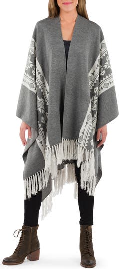 Dramatic fringe trim and a geometric pattern deliver festive cold-weather style to a cozy knit ruana that's a perfect outfit topper on chilly days.