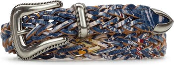 A textured metal buckle and denim-inspired print brings western flair to a leather belt with a woven design for a customizable fit.
