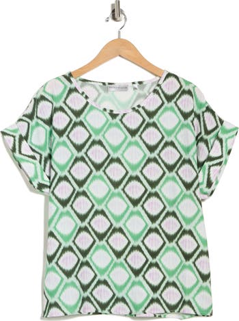 Transition from the workday to weekend in this rolled-sleeve top featuring an eye-catching honeycomb print.