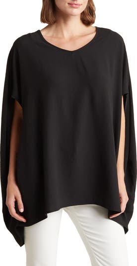 A rounded V-neck tops a flowy caftan blouse fashioned with a trendy sharkbite hem.