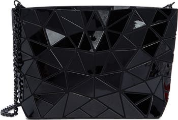 A geometric pattern lends sharpness to a clutch topped with an optional chain strap for versatile carrying styles.