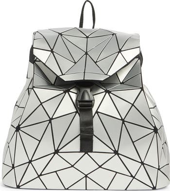 Slanted triangles add geometric flair to a backpack with a sized-down interior with room for must-have items.