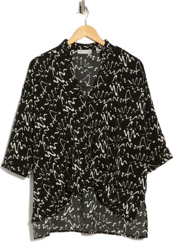 A twist-front accent gives the appearance of a tuck in this geometric-patterned top making it a perfect pick for desk-to-dinner looks.