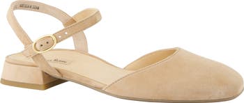 A rounded toe enhances the minimalist appeal of an ankle-strap pump constructed from soft suede or leather and lifted by a barely-there block heel.