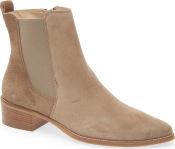 A pointy toe furthers the streamlined profile of a season-spanning suede bootie fitted with a goring inset and full-length side zipper for easy wear.