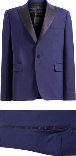 Smart and timeless, this classic tuxedo tailored from Italian wool features covered buttons at the front and cuffs and traditional satin detailing on the lapels and trousers.