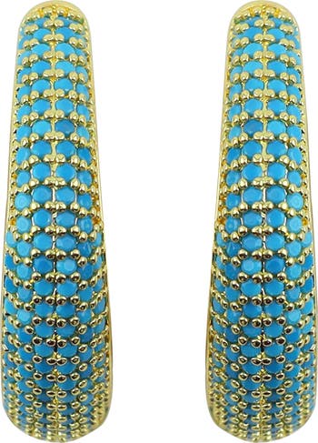 Turquoise-hued crystals bring bold color to dramatic hoop earrings plated in warm 14-karat gold for added shine.