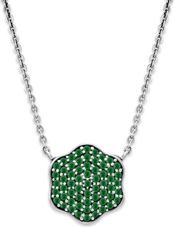 A floral-shaped pendant sparkling with pavé emeralds suspends from a delicate chain necklace handcrafted from polished sterling silver.