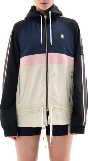 A colorblocked design and neat piping lighten the look of a hooded jacket partially made from recycled polyester for extra feel-good points.