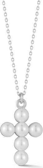 A cross pendant of lustrous pearls shines on this sterling silver chain necklace plated in rhodium.