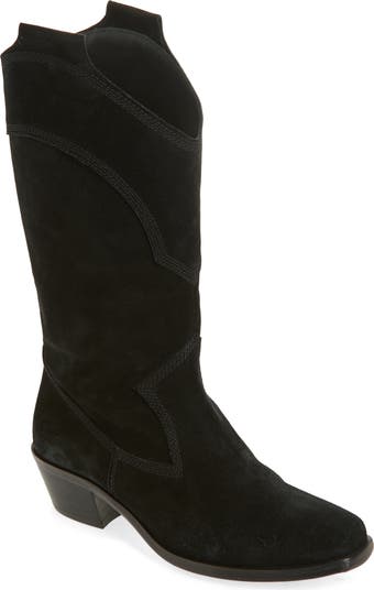 Decorative stitching and an angled heel balance a Western-inspired boot fashioned with a side pull-tabs for easy entry.