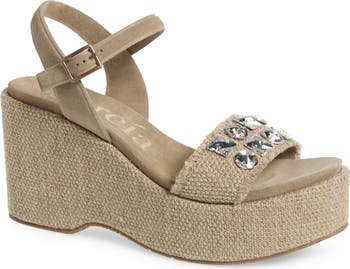 Sparkling crystals provide a stunning contrast to the earthy woven construction of this ankle-strap sandal.