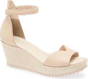 An adjustable hook-and-loop strap ensures a snug fit in this sandal made from soft pebbled leather and lofted by a platform-wedge heel.