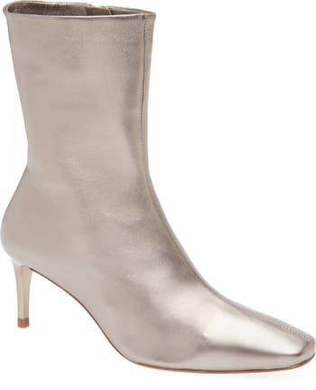 Elevate your wardrobe with this metallic leather boot fashioned in a square-toe silhouette and lifted by a slender heel.