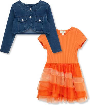 Give kiddos an outfit to look forward to with this darling denim jacket accompanied by a tiered T-shirt dress.